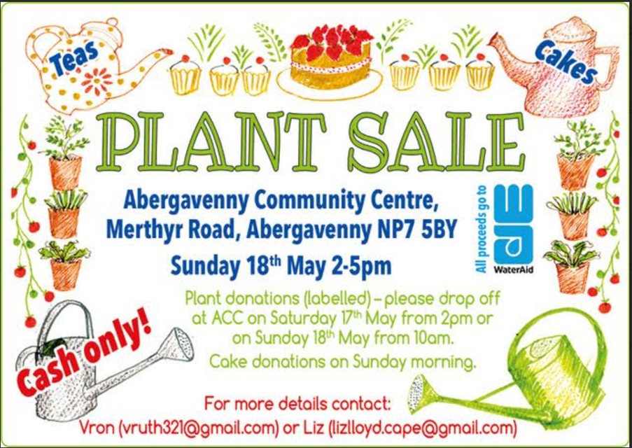 The WaterAid Plant Sale will be held on Sunday 17 May 2026 at Abergavenny Community Centre from 2-5. There’ll be live music and refreshments.